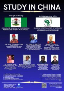 The Study in China program, brought to you by the Consulate-General of the Federal Republic of Nigeria in Shanghai, in collaboration with the Global Organization of African Academic Doctors (OAAD), is a virtual initiative to promote educational opportunities in China. Held on Zoom, the daily sessions from January 6-8, 2024, aim to guide participants through programs, scholarships, and the application process, fostering academic and professional development.
